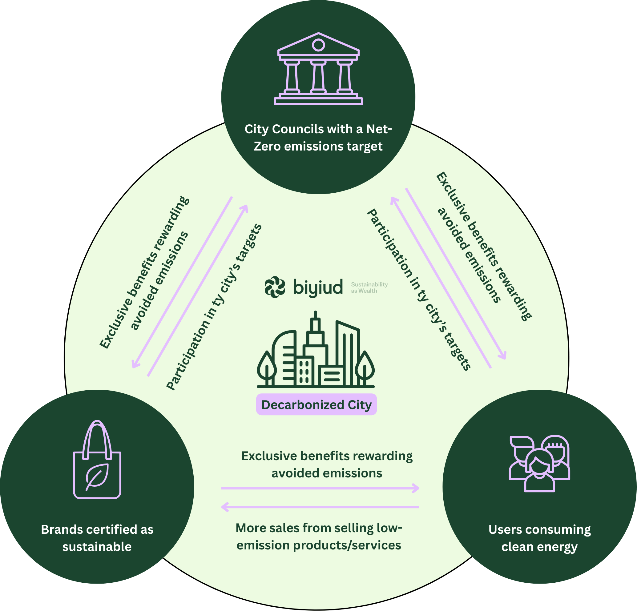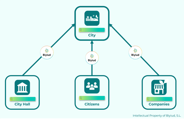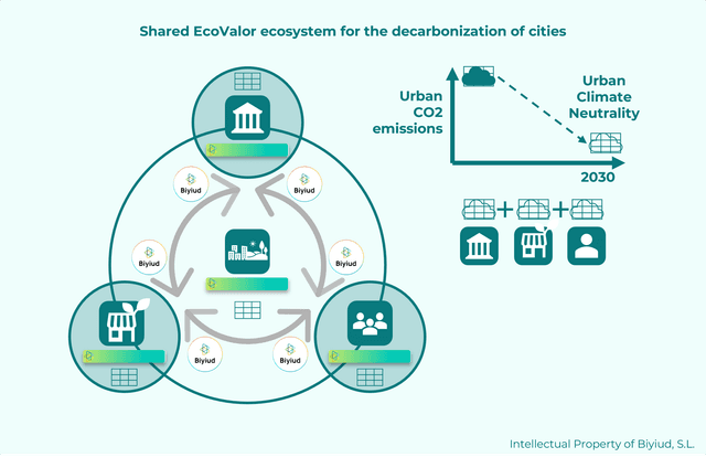 Esto crea un ecosistema de intercambio de EcoValor que beneficia la consecución de los objetivos sociales y ambientales de las ciudades. En el caso del objetivo de neutralidad climática urbana, los Biyiuds trazan las emisiones de CO2 evitadas para incentivar la colaboración entre el ayuntamiento, empresas y ciudadanos por la reducción local de las emisiones.