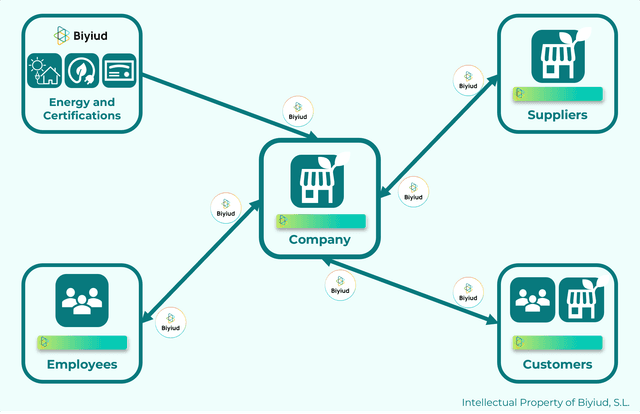 En el funcionamiento del EcoRating Biyiud el intercambio de información le permite a los consumidores finales participar activamente en la EcoReputación de las marcas. Ocurriendo lo mismo en las interacciones comerciales entre las mismas empresas.