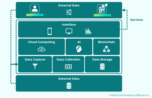 La plataforma y el Software de servicios digitales de Biyiud está estructurada con tecnologías exponenciales en la nube, configuradas en ubicaciones geográficas y con procesos bajo en emisiones de CO2: Cloud Computing, AI y Blockchain.
