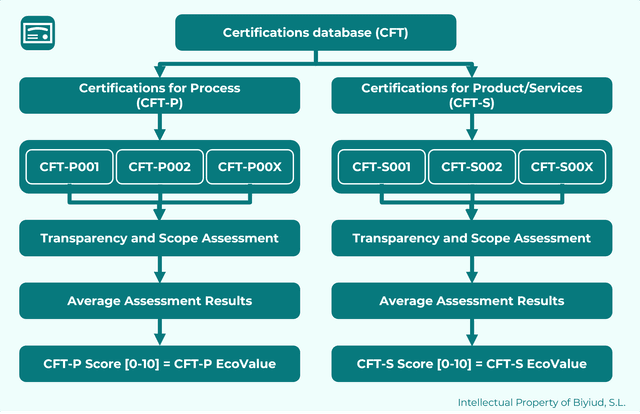 El procedimiento parte segmentando estas certificaciones por su tipología de aplicación: para certificar procesos o producto y servicios. Por ejemplo, la certificación B Corp aplica para los procesos, mientras que el etiquetado de la energía eléctrica aplica para el segmento de producto o servicio.