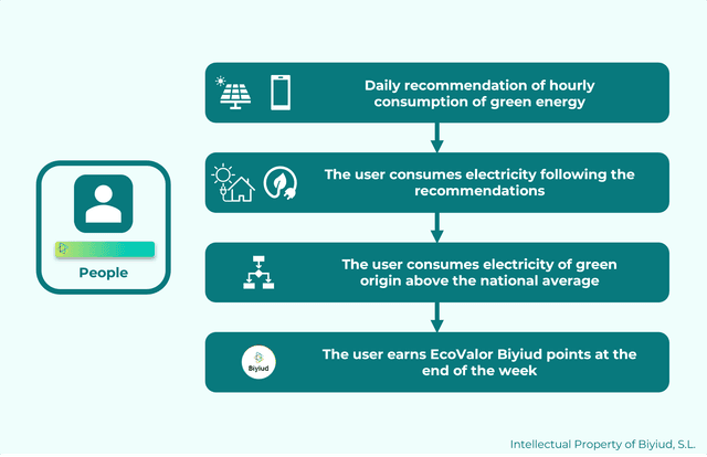 Las personas obtienen 0.1 puntos de EcoValor Biyiud al completar el registro en la plataforma (a través de una aplicación móvil). Luego pueden obtener Biyiuds respondiendo a cuestionarios periódicos que les ayudan a ampliar sus conocimientos sobre temas de sostenibilidad, como el uso responsable del agua y la energía, reciclaje, entre otros.