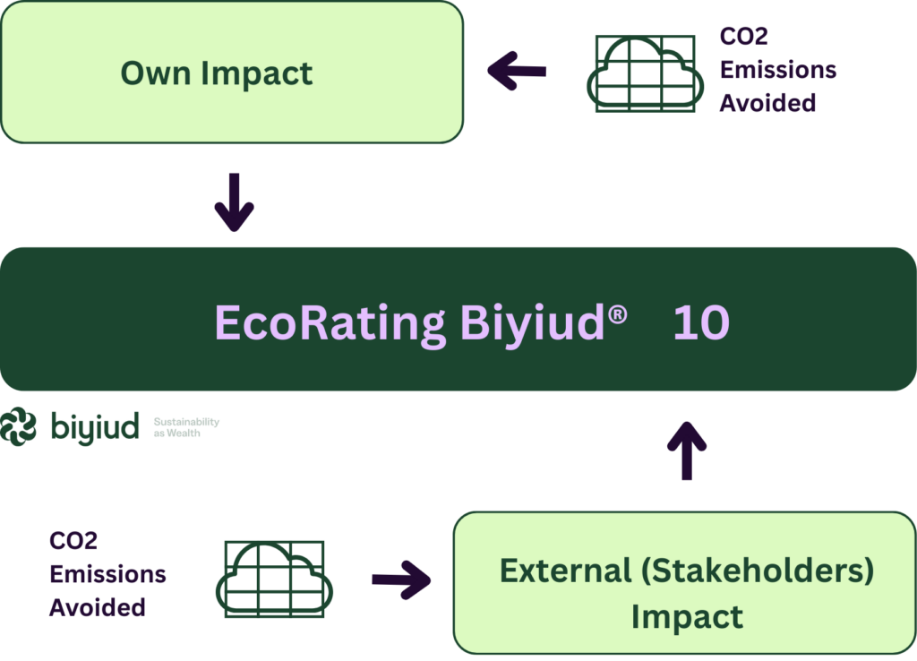 Las empresas obtienen el primer resultado de su EcoRating Biyiud con el EcoValor de sus certificaciones de sostenibilidad. Por su parte, las personas lo obtienen del EcoValor del consumo de energía de origen renovable o consumo responsable de agua en sus viviendas.
