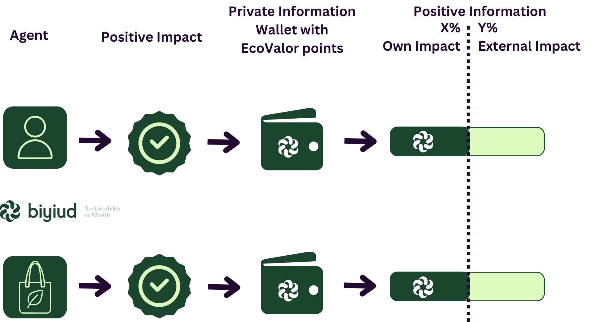 En este intercambio de información, los nuevos Biyiuds alimentan el porcentaje (Y%) restante del EcoRating Biyiud de cada parte (External Impact), lo que incentiva a que estos agentes realicen interacciones comerciales preferiblemente con los agentes de mayor impacto positivo del mercado.